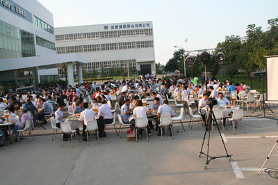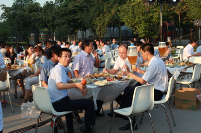 24日下午,公司辦公樓前,擺放著一排排桌椅,員工們從餐廳端著盛滿豐盛食物的餐盤,擺放在餐桌上。南面的舞臺上,工作人員在緊張的調試音響,兩只紅色的氫氣球飄揚在空中,在蔚藍的天空映襯下,格外的鮮艷,為整個會場增添了喜慶的氣氛。